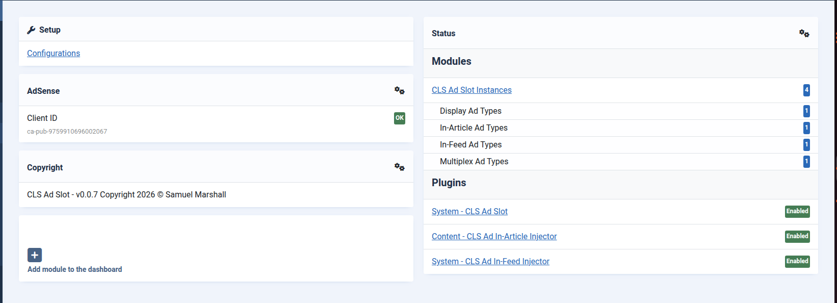 CLS Ad Slot is built as a package of coordinated Joomla extensions that work together to manage ad rendering, placement, and behaviour while maintaining layout stability.